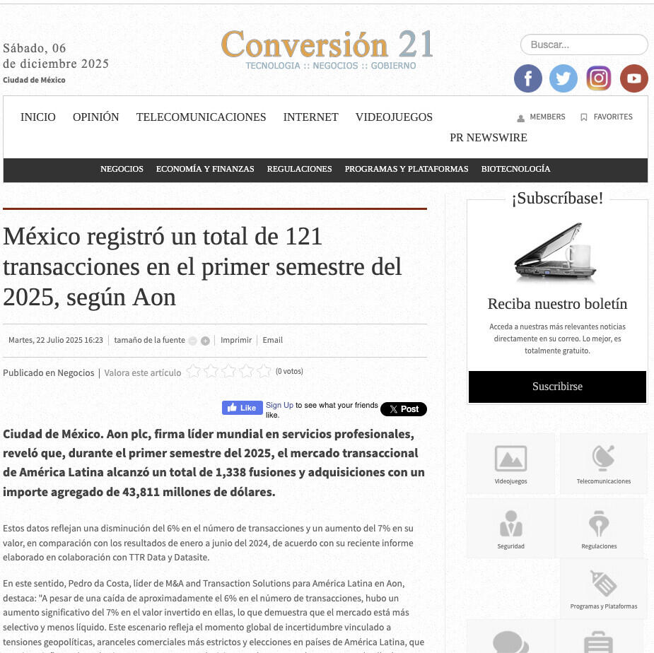 Ciudad de México. Aon plc, firma líder mundial en servicios profesionales, reveló que, durante el primer semestre del 2025, el mercado transaccional de América Latina alcanzó un total de 1,338 fusiones y adquisiciones con un importe agregado de 43,811 millones de dólares.