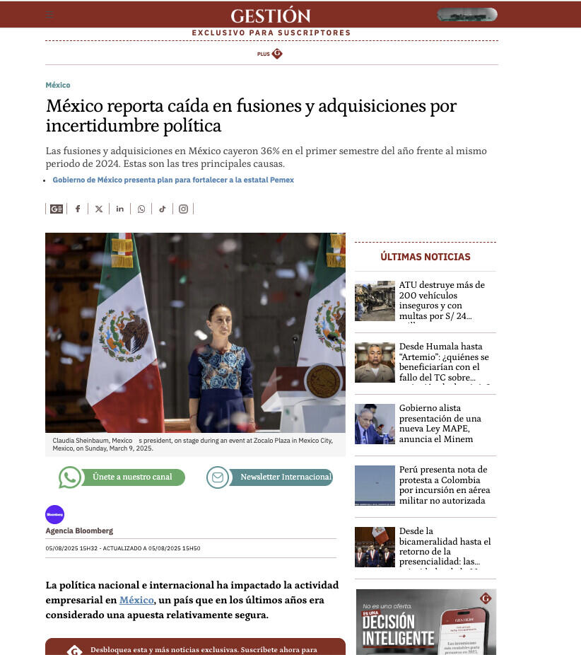 México reporta caída en fusiones y adquisiciones por incertidumbre política
