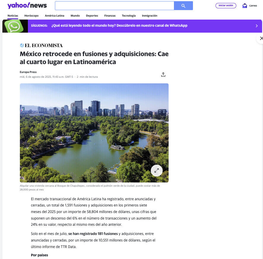 El mercado transaccional de América Latina ha registrado, entre anunciadas y cerradas, un total de 1,591 fusiones y adquisiciones en los primeros siete meses del 2025 por un importe de 58,804 millones de dólares, unas cifras que suponen un descenso del 6% en el número de transacciones y un aumento del 24% en su valor, respecto al mismo mes del año anterior.