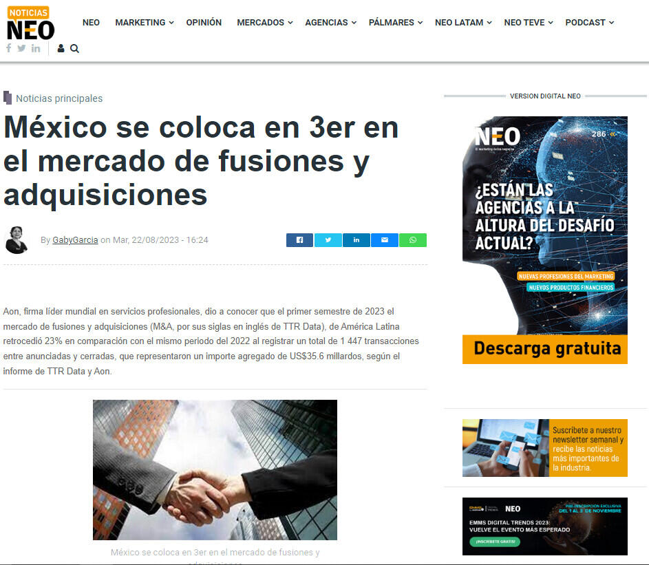 Aon, firma líder mundial en servicios profesionales, dio a conocer que el primer semestre de 2023 el mercado de fusiones y adquisiciones (M&A, por sus siglas en inglés de TTR Data), de América Latina retrocedió 23% en comparación con el mismo periodo del 2022 al registrar un total de 1 447 transacciones entre anunciadas y cerradas, que representaron un importe agregado de US$35.6 millardos, según el informe de TTR Data y Aon.