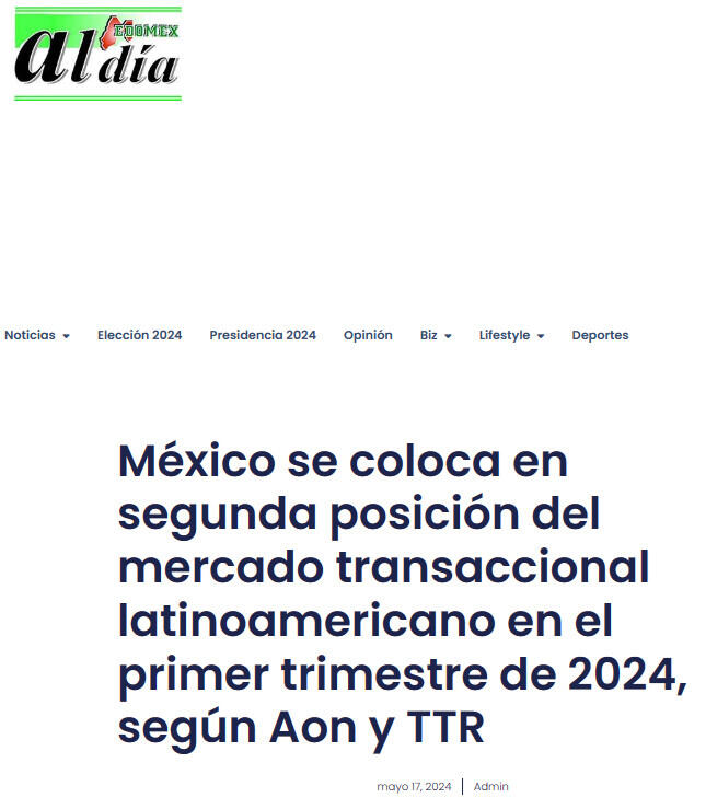 México se coloca en segunda posición del mercado transaccional latinoamericano en el primer trimestre de 2024, según Aon y TTR