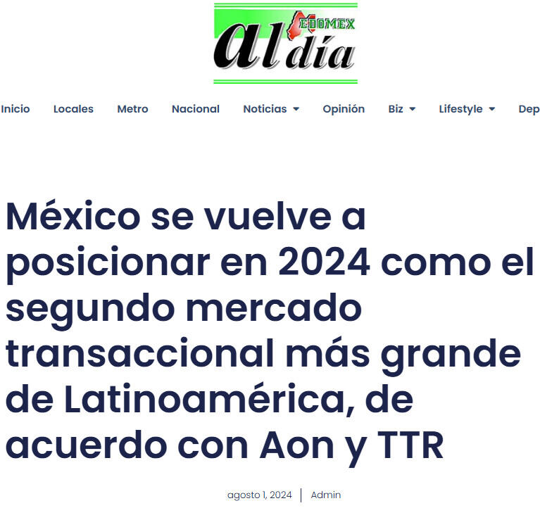 México se vuelve a posicionar en 2024 como el segundo mercado transaccional más grande de Latinoamérica, de acuerdo con Aon y TTR