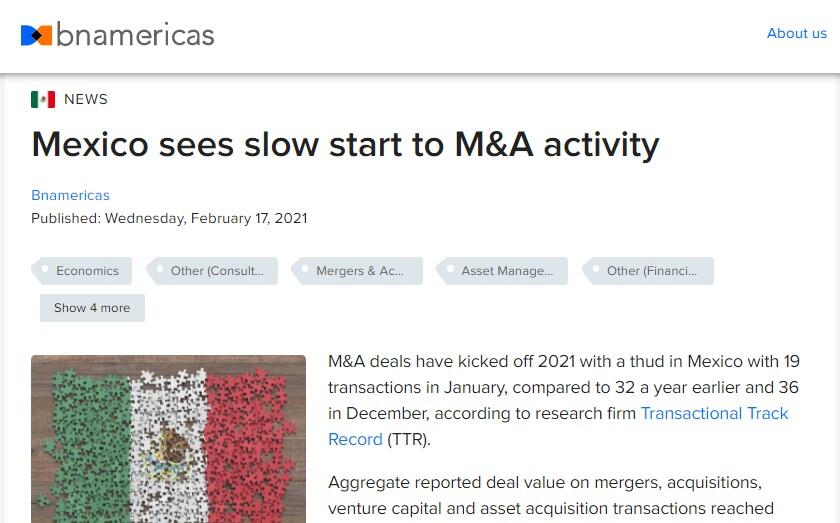 M&A deals have kicked off 2021 with a thud in Mexico with 19 transactions in January, compared to 32 a year earlier and 36 in December, according to research firm Transactional Track Record (TTR).