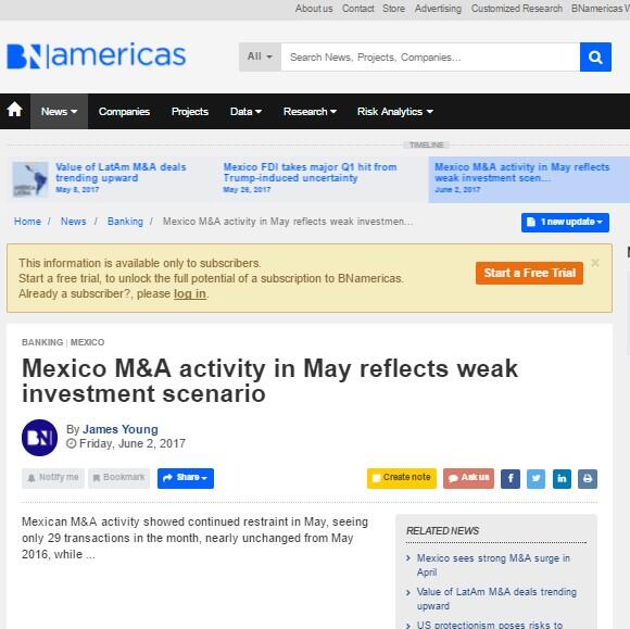 Mexican M&A activity showed continued restraint in May, seeing only 29 transactions in the month,nearly unchanged from May 2016, while the value of the 12 publicly disclosed deals was down 13.55% yearonyear to US$639mn.