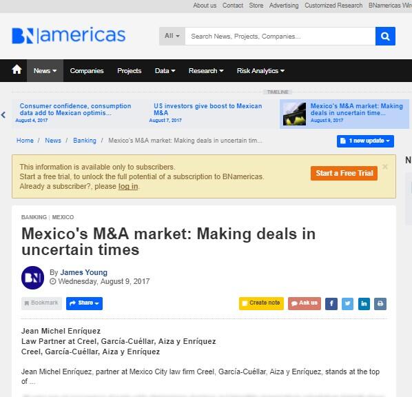 M&A research firm Transactional Track Record recently recognized Creel, GarcíaCuéllar, Aiza y Enríquez as the leading firm thus far in 2017 for advising on deals coming out of the US and targeting Mexico