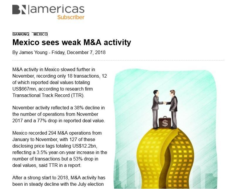 M&A activity in Mexico slowed further in November, recording only 18 transactions, 12 of which reported deal values totaling US$667mn, according to research firm Transactional Track Record (TTR).