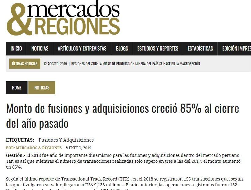Según el último reporte de Transactional Track Record (TTR) , en el 2018 se registraron 155 transacciones que, según las que divulgaron su valor, llegaron a US$ 9,133 millones. El año anterior, las operaciones registradas fueron 152. De ellas, las de valor divulgado alcanzaron los US$ 4,937 millones.