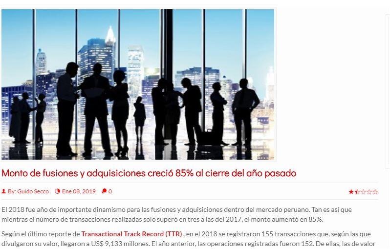 Según el último reporte de Transactional Track Record (TTR) , en el 2018 se registraron 155 transacciones que, según las que divulgaron su valor, llegaron a US$ 9,133 millones. El año anterior, las operaciones registradas fueron 152. De ellas, las de valor divulgado alcanzaron los US$ 4,937 millones.