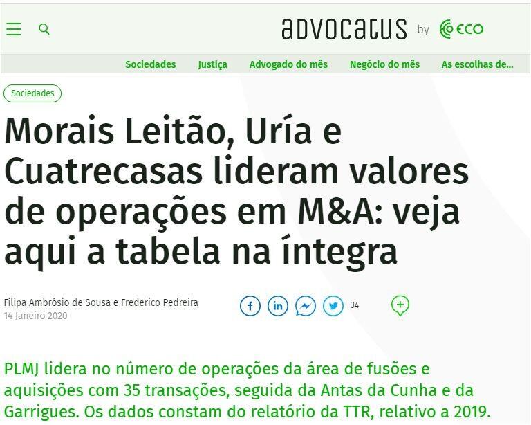 O mercado português registou 427 fusões e aquisições em 2019, mais 15,09% em relação ao ano anterior. Segundo o TTR-Transactional Track Record, ao nível da assessoria jurídica do ano passado, o relatório divulga que a Morais Leitão lidera o ranking por valor com 3 milhões e 700 mil euros (no total de 20 operações), seguido da Uría Menéndez – Proença de Carvalho, com 3 milhões 113 mil euros (distribuídos em 11 operações) e a Cuatrecasas com 2 milhões e 800 mil euros (com 16 operações).