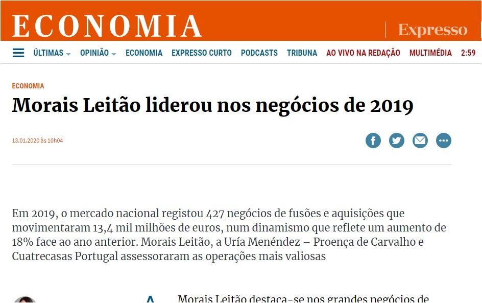 Morais Leitão destaca-se nos grandes negócios de fusões e aquisições feitos em Portugal em 2019, segundo o Transactional Track Record (TTR) que dá conta que o mercado nacional foi palco de 427 transações no valor de 13 395 milhões de euros.