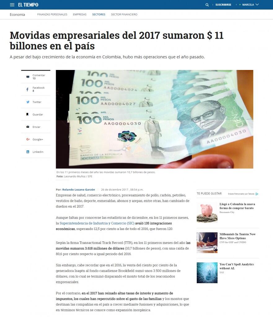 Movidas empresariales del 2017 sumaron $ 11 billones en el país