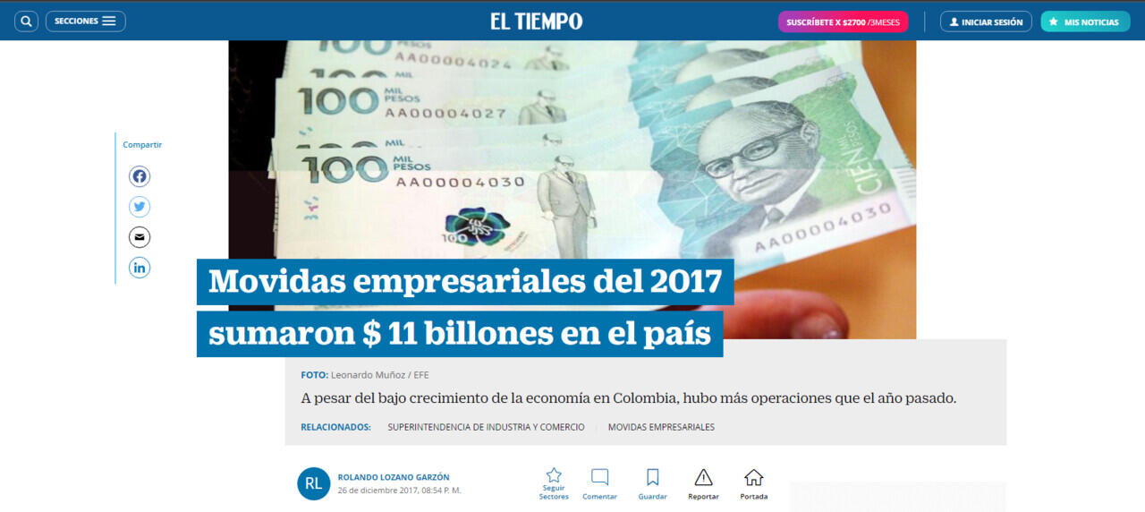 Movidas empresariales del 2017 sumaron $ 11 billones en el país