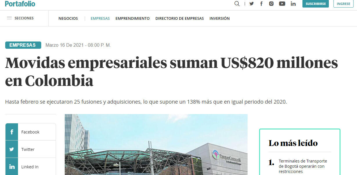 En el análisis por países durante el bimestre, Colombia ocupa la cuarta posición con 25 transacciones y un capital movilizado que ha alcanzado los US$820 millones, con un aumento del 138% respecto al año anterior.