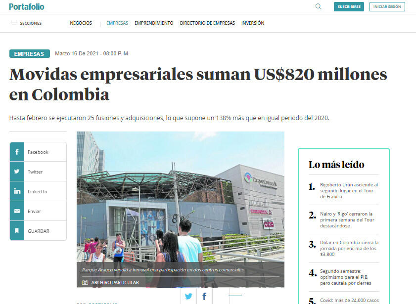 Igualmente, aparece el negocio que hizo Parque Arauco que vendió a Inmoval una participación en los centros comerciales Caracolí y La Colina, por US$161,1 millones.