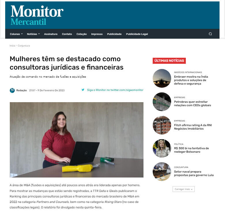 A área de M&A (fusões e aquisições) até poucos anos atrás era liderada apenas por homens. Para mostrar as mudanças que estão sendo registradas, a TTR Data e iDeals publicaram o Ranking das principais consultoras jurídicas e financeiras do mercado brasileiro de M&A em 2022 na categoria Partners and Counsels, bem como na categoria Rising Stars (no caso de classificações legais). O relatório foi divulgado nesta quinta-feira.