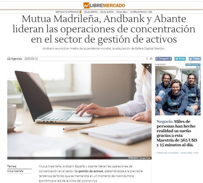 Andbank se ha erigido en una de las entidades más activas en este proceso de concentración. En pleno mes de marzo anunció la adquisición de Esfera Capital Gestión, en un momento en el que los mercados vivían un desplome histórico y en el que las operaciones de fusiones y adquisiciones retrocedían en España un 90%, según datos de Transitional Track Record (TTR).