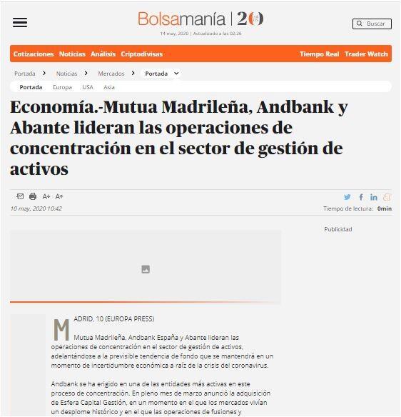 Andbank se ha erigido en una de las entidades más activas en este proceso de concentración. En pleno mes de marzo anunció la adquisición de Esfera Capital Gestión, en un momento en el que los mercados vivían un desplome histórico y en el que las operaciones de fusiones y adquisiciones retrocedían en España un 90%, según datos de Transitional Track Record (TTR).