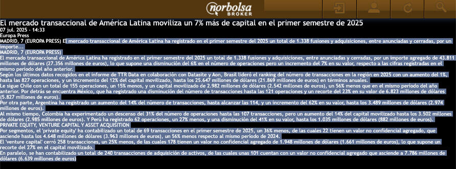 NORBOLSA Buscador de valores Cambio de idioma: euskera El mercado transaccional de América Latina moviliza un 7% más de capital en el primer semestre de 2025