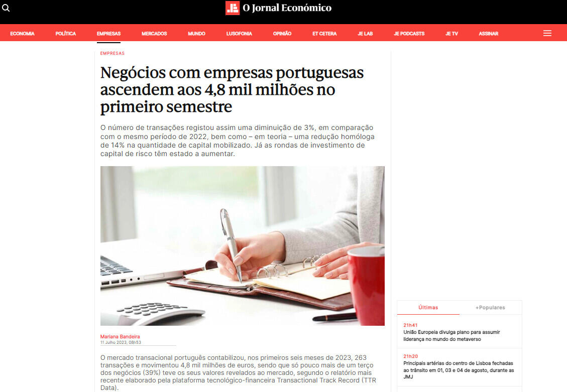 O mercado transacional português contabilizou, nos primeiros seis meses de 2023, 263 transações e movimentou 4,8 mil milhões de euros, sendo que só pouco mais de um terço dos negócios (39%) teve os seus valores revelados ao mercado, segundo o relatório mais recente elaborado pela plataforma tecnológico-financeira Transactional Track Record (TTR Data).