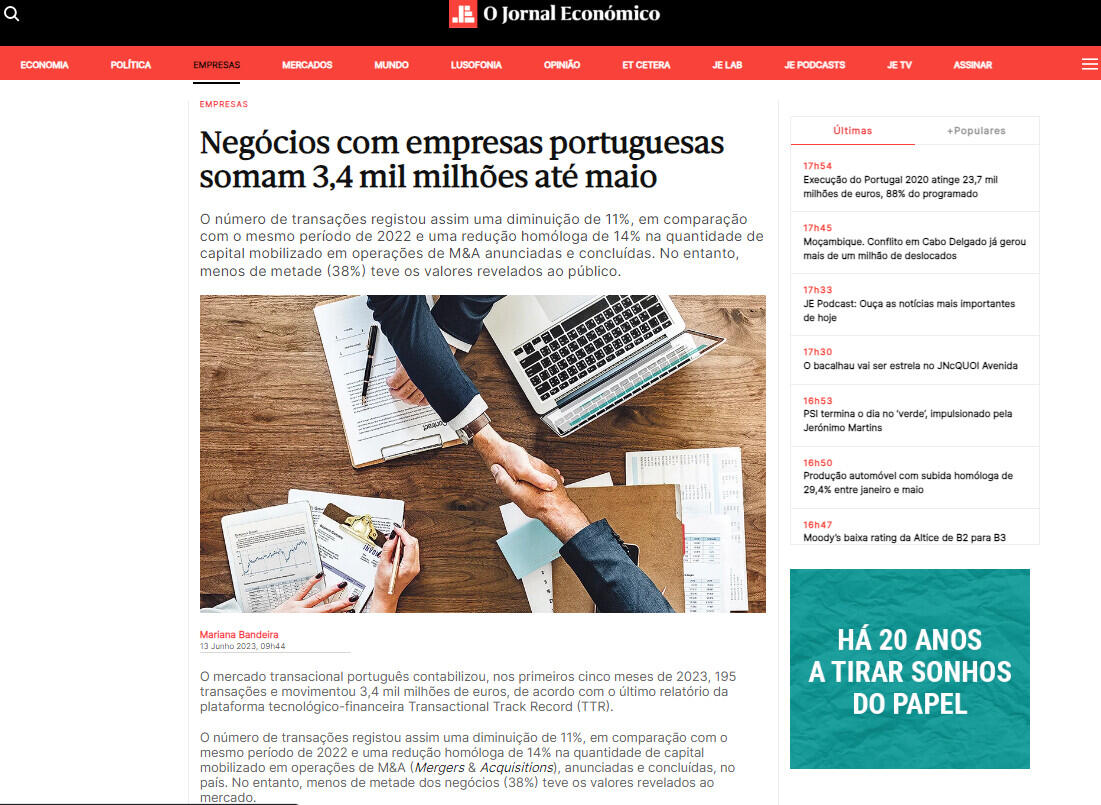 O mercado transacional português contabilizou, nos primeiros cinco meses de 2023, 195 transações e movimentou 3,4 mil milhões de euros, de acordo com o último relatório da plataforma tecnológico-financeira Transactional Track Record (TTR).