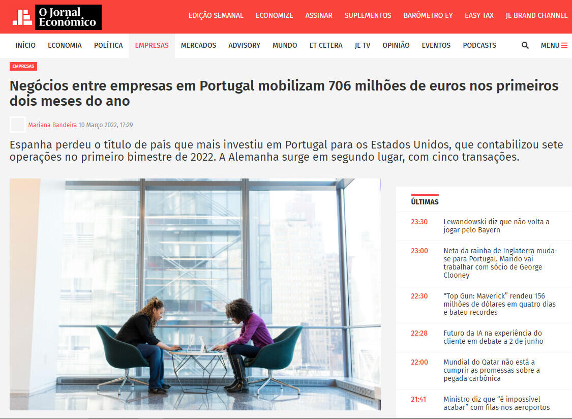 Espanha perdeu o título de país que mais investiu em Portugal para os Estados Unidos, que contabilizou sete operações no primeiro bimestre de 2022. A Alemanha surge em segundo lugar, com cinco transações.