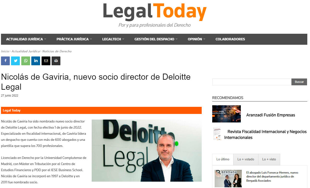 Nicolás de Gaviria ha sido nombrado nuevo socio director de Deloitte Legal, con fecha efectiva 1 de junio de 2022. Especializado en fiscalidad internacional, de Gaviria lidera un despacho que cuenta con más de 600 abogados y una plantilla que supera los 700 profesionales.