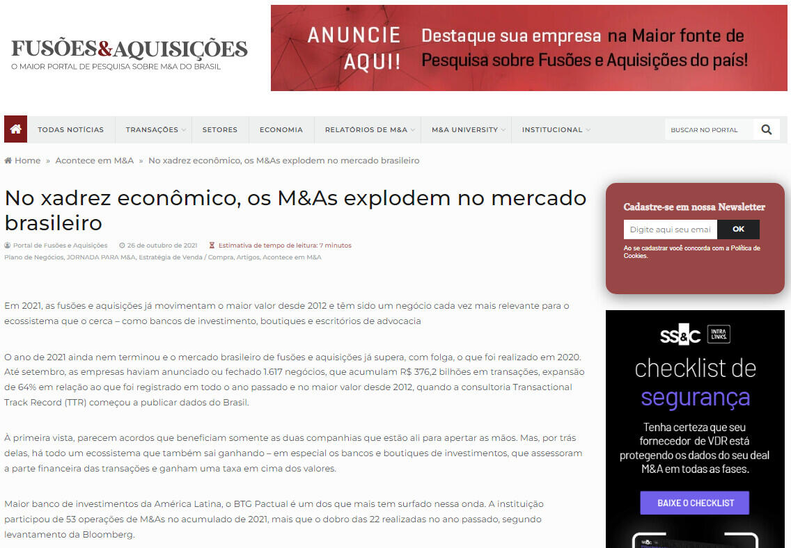 Em 2021, as fusões e aquisições já movimentam o maior valor desde 2012 e têm sido um negócio cada vez mais relevante para o ecossistema que o cerca – como bancos de investimento, boutiques e escritórios de advocacia