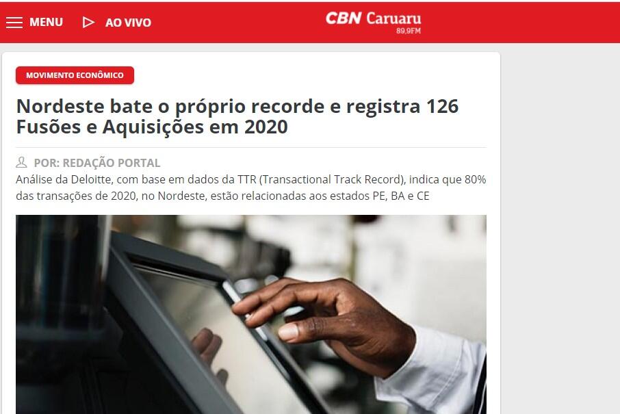 Análise da Deloitte, com base em dados da TTR (Transactional Track Record), indica que 80% das transações de 2020, no Nordeste, estão relacionadas aos estados PE, BA e CE