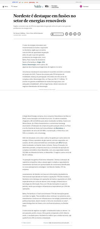 Um levantamento realizado até o início de maio de 2025 e concluído pelas áreas de estratégia de grandes bancos de investimento indica que as aquisições no setor de geração renovável no NE resultam da conclusão dos leilões regionais de 2024. Foi o caso do projeto Triunfo, arrematado por uma subsidiária da norueguesa Scatec no leilão setorial promovido pela ANEEL no Piauí, e deve ser executado no segundo bimestre, diz Alvaro Hupfer, diretor executivo de negócios bancarizados do Investgen.