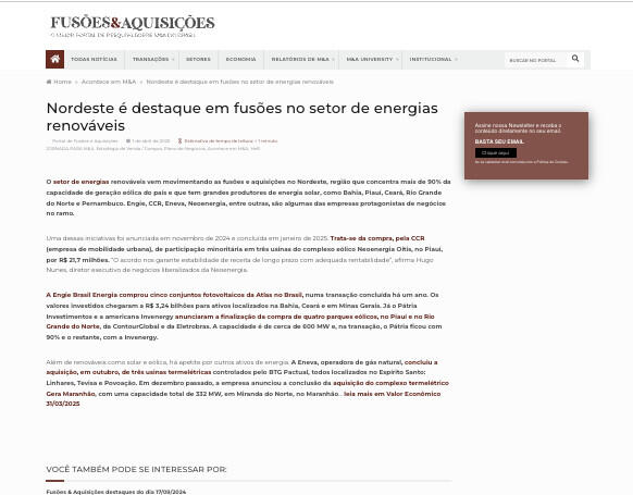 O setor de energias renováveis vem movimentando as fusões e aquisições no Nordeste, região que concentra mais de 90% da capacidade de geração eólica do país e que tem grandes produtores de energia solar, como Bahia, Piauí, Ceará, Rio Grande do Norte e Pernambuco. Engie, CCR, Eneva, Neoenergia, entre outras, são algumas das empresas protagonistas de negócios no ramo.