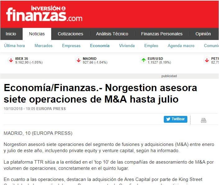Norgestion asesoró siete operaciones del segmento de fusiones y adquisiciones (M&A) entre enero y julio de este año, incluyendo private equity y venture capital, según ha informado.