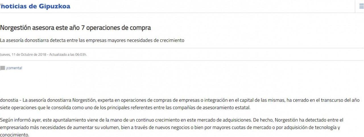 La asesoría donostiarra Norgestión, experta en operaciones de compras de empresas o integración en el capital de las mismas, ha cerrado en el transcurso del año siete operaciones que le consolida como uno de los principales referentes entre las compañías de asesoramiento estatal, según la consultora TTR.