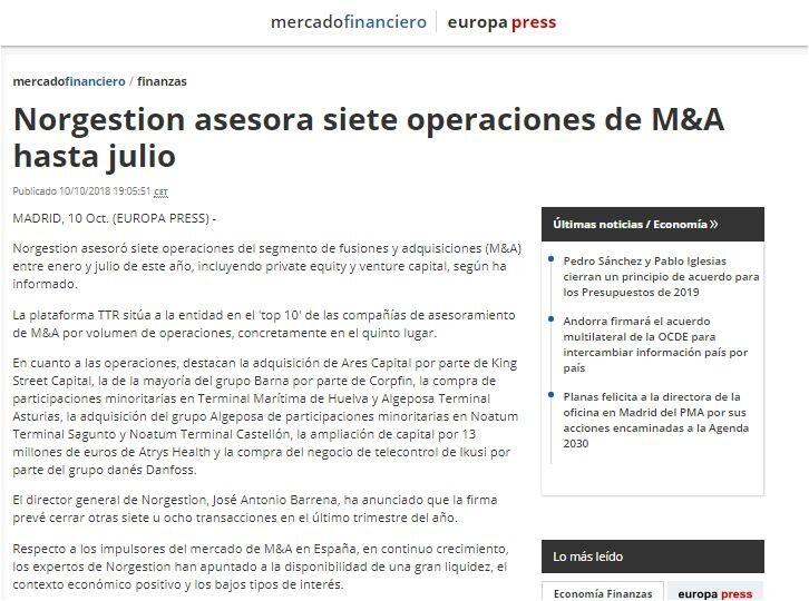 Norgestion asesora siete operaciones de M&A hasta julio