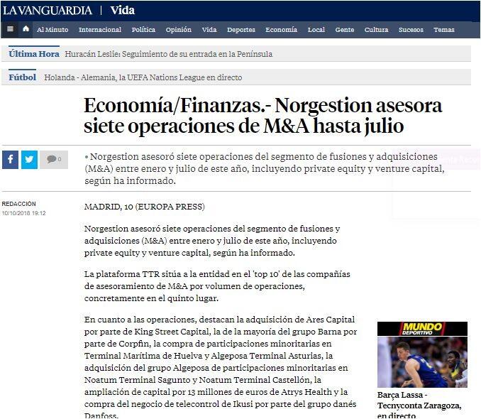 Norgestion asesoró siete operaciones del segmento de fusiones y adquisiciones (M&A) entre enero y julio de este año, incluyendo private equity y venture capital, según ha informado.
