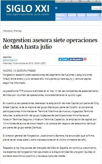 En cuanto a las operaciones, destacan la adquisición de Ares Capital por parte de King Street Capital, la de la mayoría del grupo Barna por parte de Corpfin, la compra de participaciones minoritarias en Terminal Marítima de Huelva y Algeposa Terminal Asturias, la adquisición del grupo Algeposa de participaciones minoritarias en Noatum Terminal Sagunto y Noatum Terminal Castellón, la ampliación de capital por 13 millones de euros de Atrys Health y la compra del negocio de telecontrol de Ikusi por parte del grupo danés Danfoss.