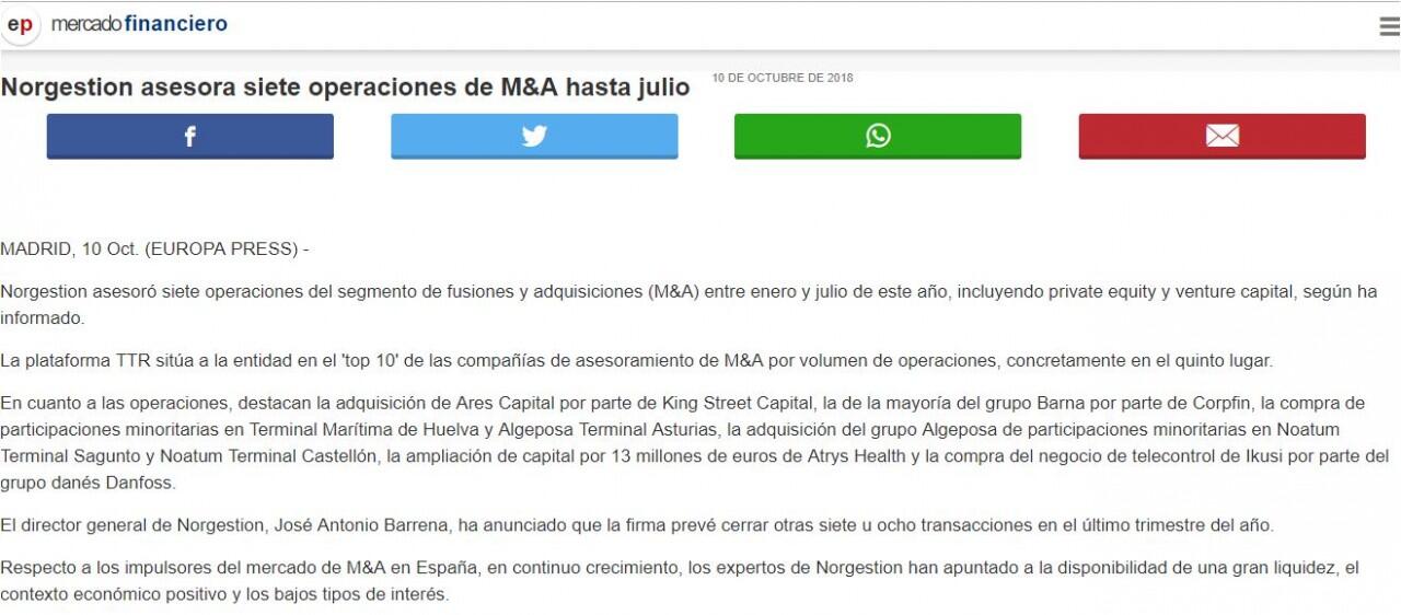 Norgestion asesoró siete operaciones del segmento de fusiones y adquisiciones (M&A) entre enero y julio de este año, incluyendo private equity y venture capital, según ha informado.