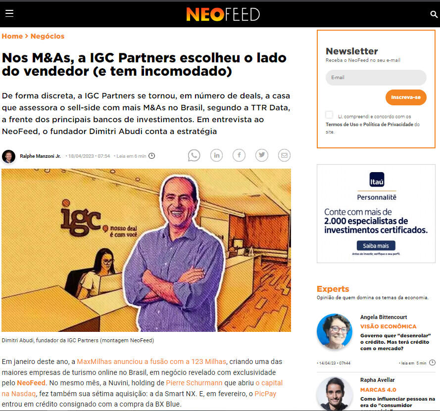 De forma discreta, a IGC Partners se tornou, emm número de deals, a casa que assesora o sell-side com mais M&As no Brasil, segundo a TTR Data, a frente dos principais bancos de investimentos. Em entrevista ao NeoFeed, o fundador Dimitri Abudi conta a estratégia