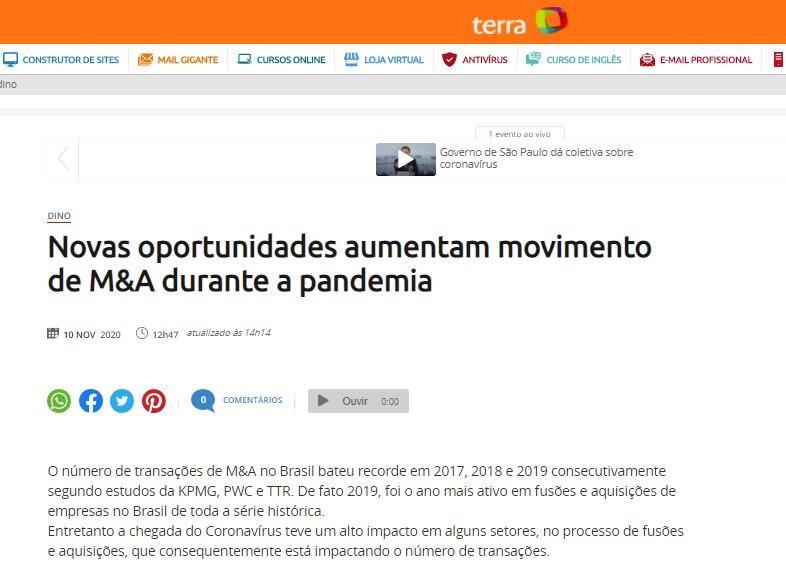 Segundo a CAPITAL INVEST - M&A Advisors, uma das principais boutiques de M&A do Brasil, inicialmente os sócios de empresas e investidores foram surpreendidos pelo impacto da pandemia, e algumas transações em andamento foram adiadas. Após meses de pandemia, e já com a perspectiva de uma vacina e houve retomada das negociações adiadas, e novas oportunidades.
