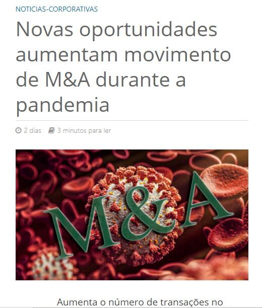 Segundo a CAPITAL INVEST – M&A Advisors, uma das principais boutiques de M&A do Brasil, inicialmente os sócios de empresas e investidores foram surpreendidos pelo impacto da pandemia, e algumas transações em andamento foram adiadas. Após meses de pandemia, e já com a perspectiva de uma vacina e houve retomada das negociações adiadas, e novas oportunidades.