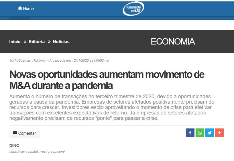 Segundo a CAPITAL INVEST - M&A Advisors, uma das principais boutiques de M&A do Brasil, inicialmente os sócios de empresas e investidores foram surpreendidos pelo impacto da pandemia, e algumas transações em andamento foram adiadas. Após meses de pandemia, e já com a perspectiva de uma vacina e houve retomada das negociações adiadas, e novas oportunidades.