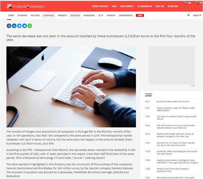 The number of mergers and acquisitions of companies in Portugal fell in the first four months of the year, to 109 operations, less than 14% compared to the same period in 2019. The transactional market retreated until April in terms of volume, but the same does not happen in the amount handled, these businesses: 6,5 billion euros, plus 87%.