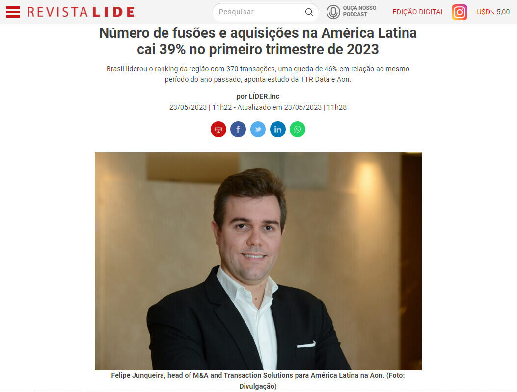A Aon plc (NYSE: AON), líder global em serviços profissionais, atualizou o relatório patrocinado pela empresa e realizado pela TTR Data sobre o mercado de fusões e aquisições (M&A) na América Latina, agora trazendo os dados referentes aos primeiros três meses de 2023.