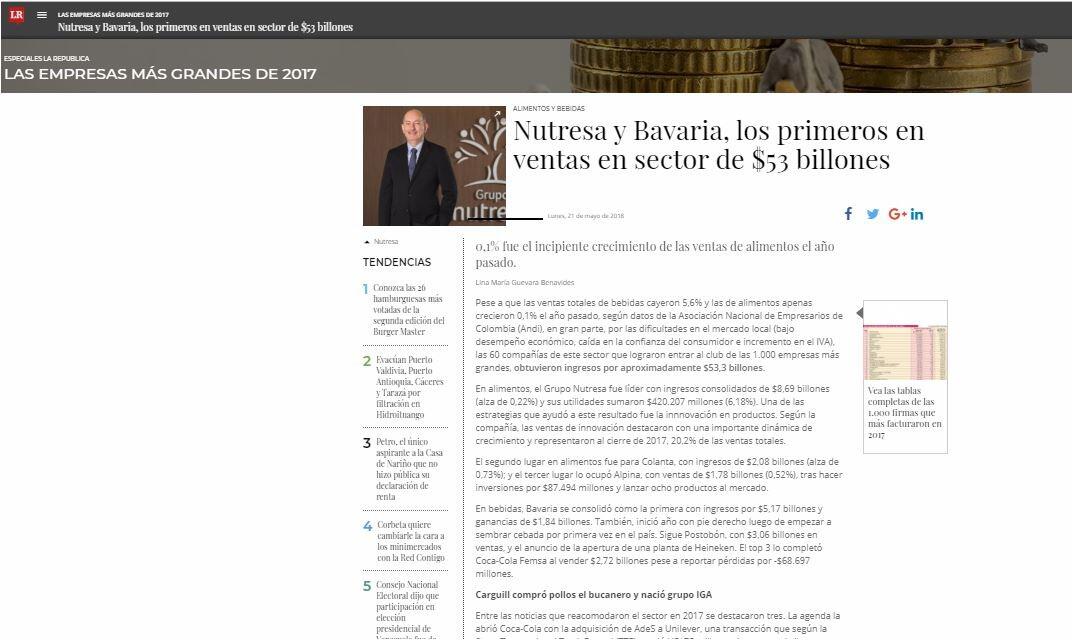 Nutresa y Bavaria, los primeros en ventas en sector de $53 billones