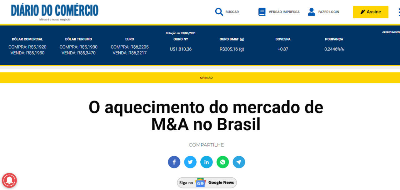 Leia mais: O aquecimento do mercado de M&A no Brasil - Diário do Comércio Em: https://diariodocomercio.com.br/opiniao/o-aquecimento-do-mercado-de-ma-no-brasil
