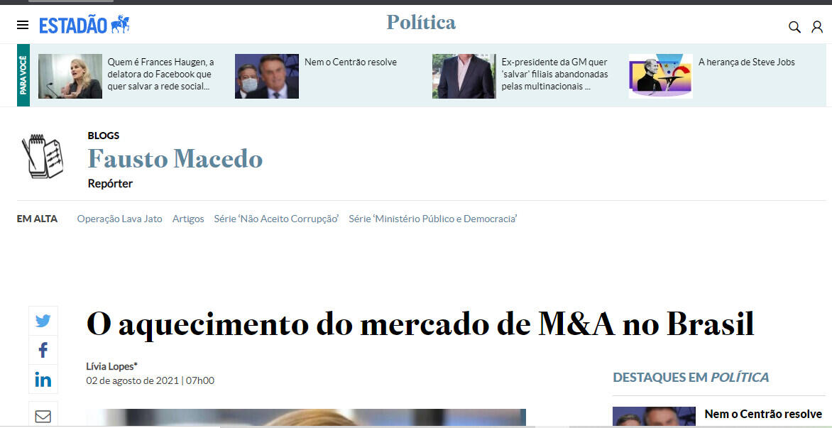 Leia mais: O aquecimento do mercado de M&A no Brasil - Diário do Comércio Em: https://diariodocomercio.com.br/opiniao/o-aquecimento-do-mercado-de-ma-no-brasil