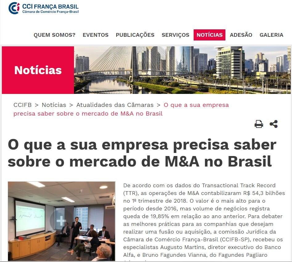 De acordo com os dados do Transactional Track Record (TTR), as operações de M&A contabilizaram R$ 54,3 bilhões no 1º trimestre de 2018. O valor é o mais alto para o período desde 2016, mas volume de negócios registra queda de 19,85% em relação ao ano anterior. Para debater as melhores práticas para as companhias que desejam realizar uma fusão ou aquisição, a comissão Jurídica da Câmara de Comércio França-Brasil (CCIFB-SP), recebeu os especialistas Augusto Martins, diretor executivo do Banco Alfa, e Bruno Fagundes Vianna, do Fagundes Pagliaro Advogados.