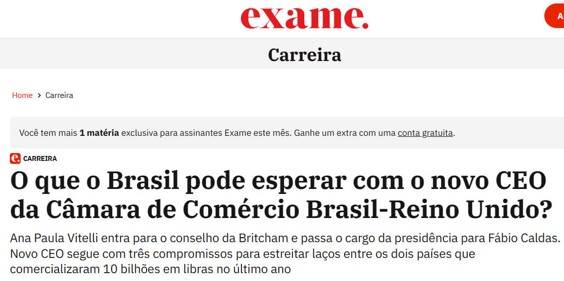 A Britcham (Câmara Britânica de Comércio e Indústria no Brasil), que atua promovendo a relação bilateral entre Brasil e Reino Unido nas áreas de comércio, indústria e serviços, tem um novo CEO a partir desta quinta-feira, 28. Após 4 anos na liderança da instituição, Ana Paula Vitelli vai para o Conselho e passa o cargo de CEO para Fabio Caldas, que assume hoje a cadeira.