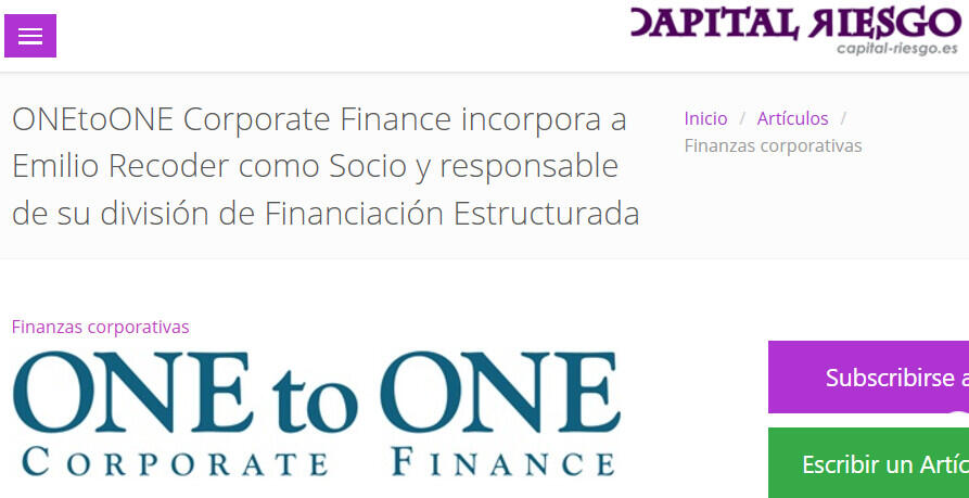 La firma internacional de banca de inversión ONEtoONE Corporate Finance anuncia la incorporación de Emilio Recoder como Socio y nuevo responsable de su división de Financiación Estructurada.