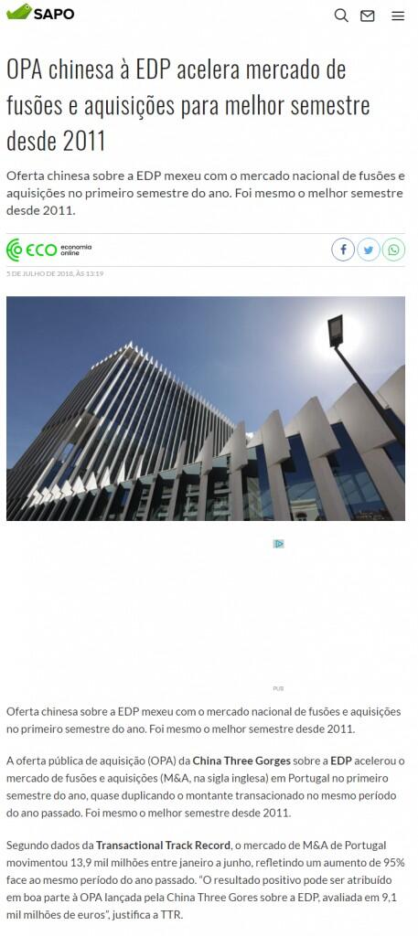 A oferta pública de aquisição (OPA) da China Three Gorges sobre a EDP acelerou o mercado de fusões e aquisições (M&A, na sigla inglesa) em Portugal no primeiro semestre do ano, quase duplicando o montante transacionado no mesmo período do ano passado. Foi mesmo o melhor semestre desde 2011.