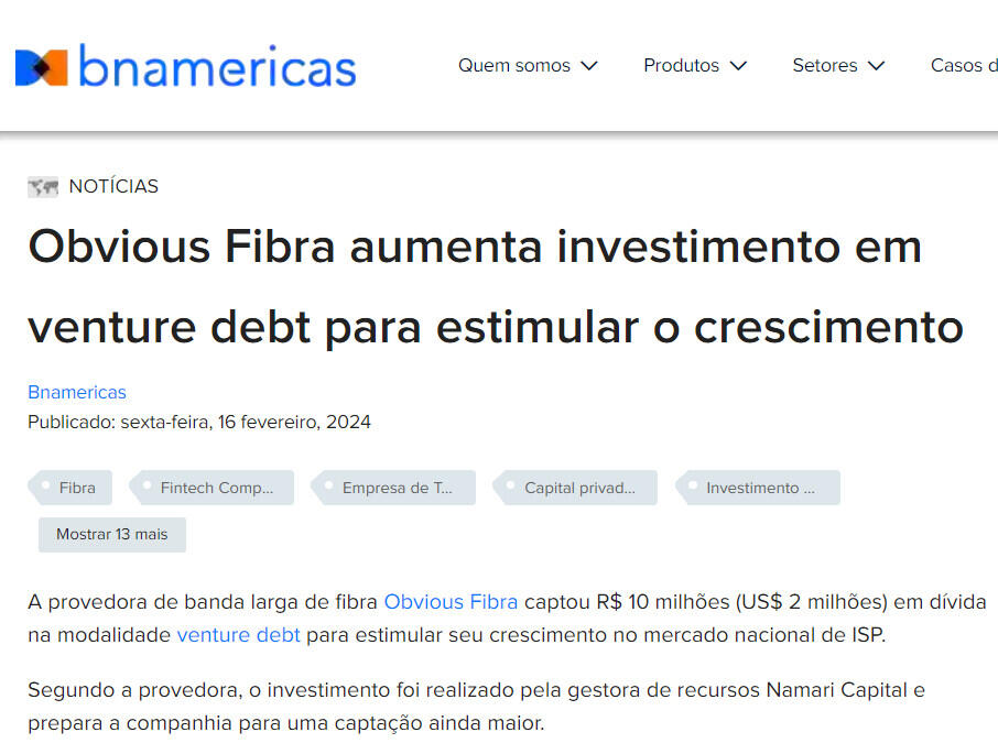 A provedora de banda larga de fibra Obvious Fibra captou R$ 10 milhões (US$ 2 milhões) em dívida na modalidade venture debt para estimular seu crescimento no mercado nacional de ISP.